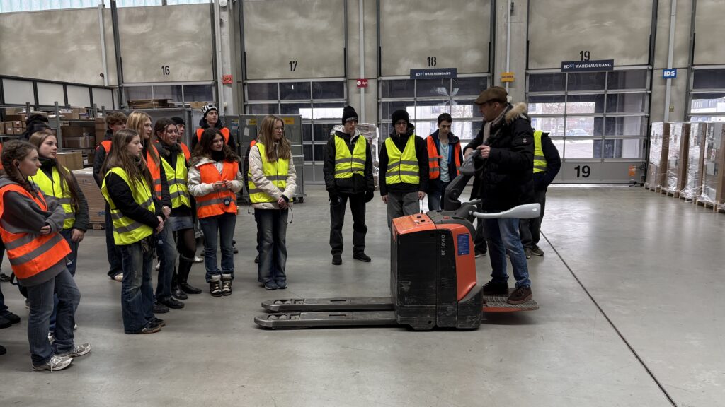 Vor Ort wurden unsere Schülerinnen und Schüler von Carsten Neise aus der Kontraktlogistik durch den Betrieb geführt. Dabei erhielten sie einen anschaulichen Einblick in die Abläufe eines modernen Logistikstandorts – vom Wareneingang über die Einlagerung bis hin zum Warenausgang.